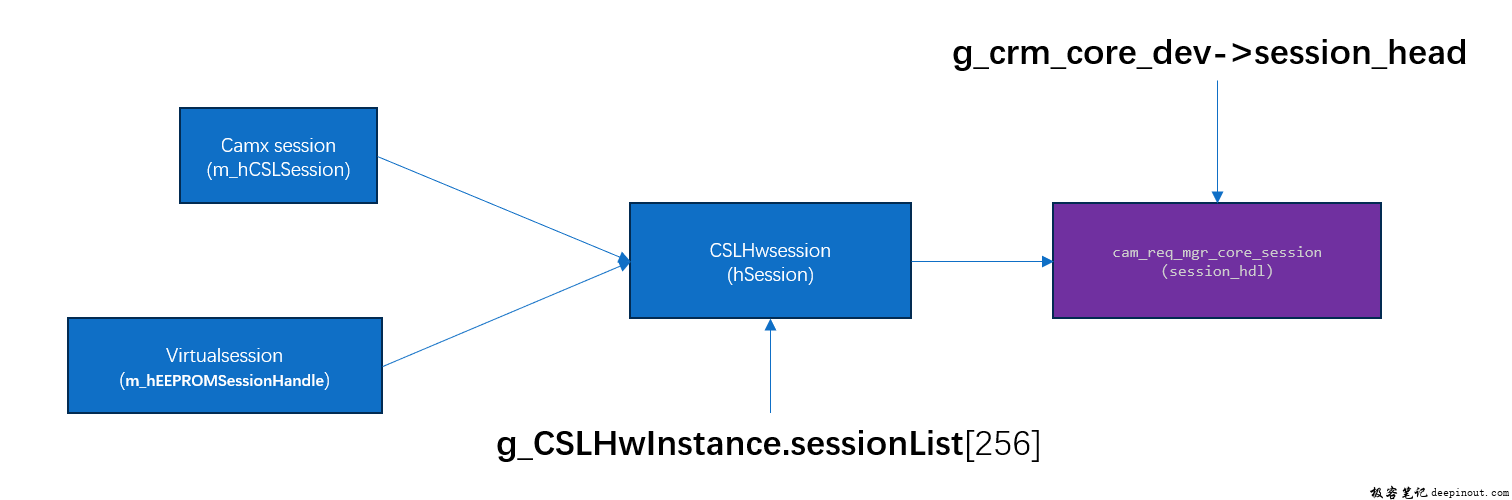 - 一个crm session对应一个虚拟session, 例如eeprom在camx session创建之前就需要读取eeprom数据,这时会创建一个virtual session对应底层一个crm session