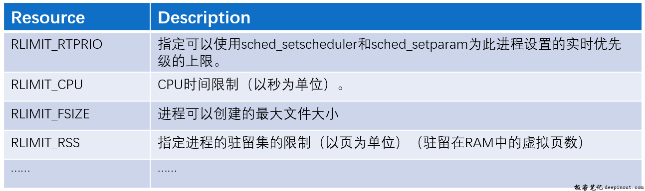 rlimit(resource limit)用于指定资源限制,作用同setrlimit API。