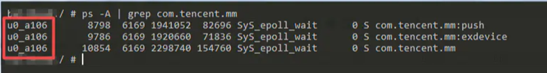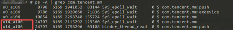 这个 u0_a106 表示该应用是 user 0(主用户)下面的应用,id是 106